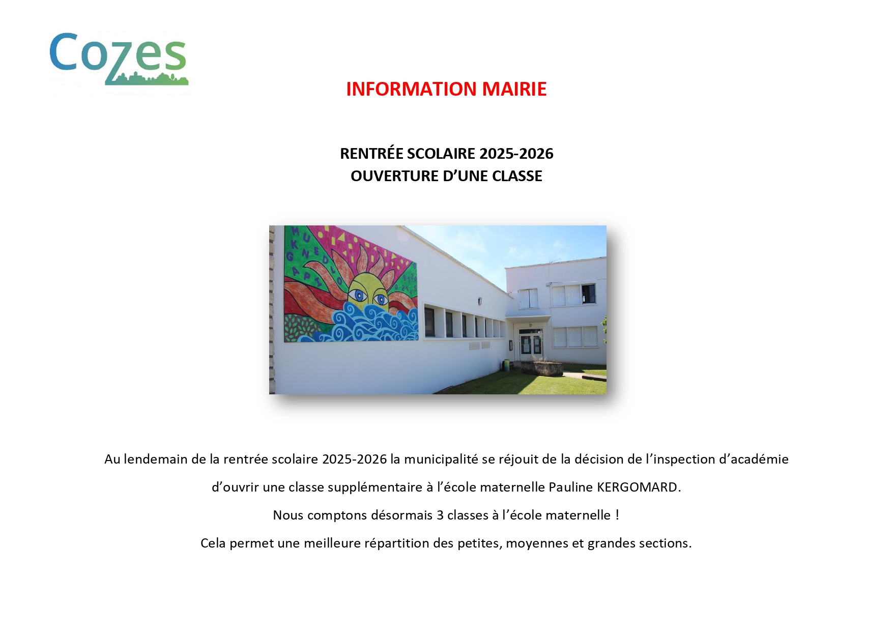 Ouverture d'une classe à la maternelle Pauline KERGOMARD