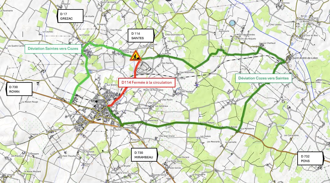 Contournement Nord de Cozes : fermeture de la RD 114 vers Saintes du 20 au 31 octobre 2025, mise en place d'itinéraires de déviation par Grézac (RD 17 et RD 243) et Saint-André-de-Lidon (RD 732)