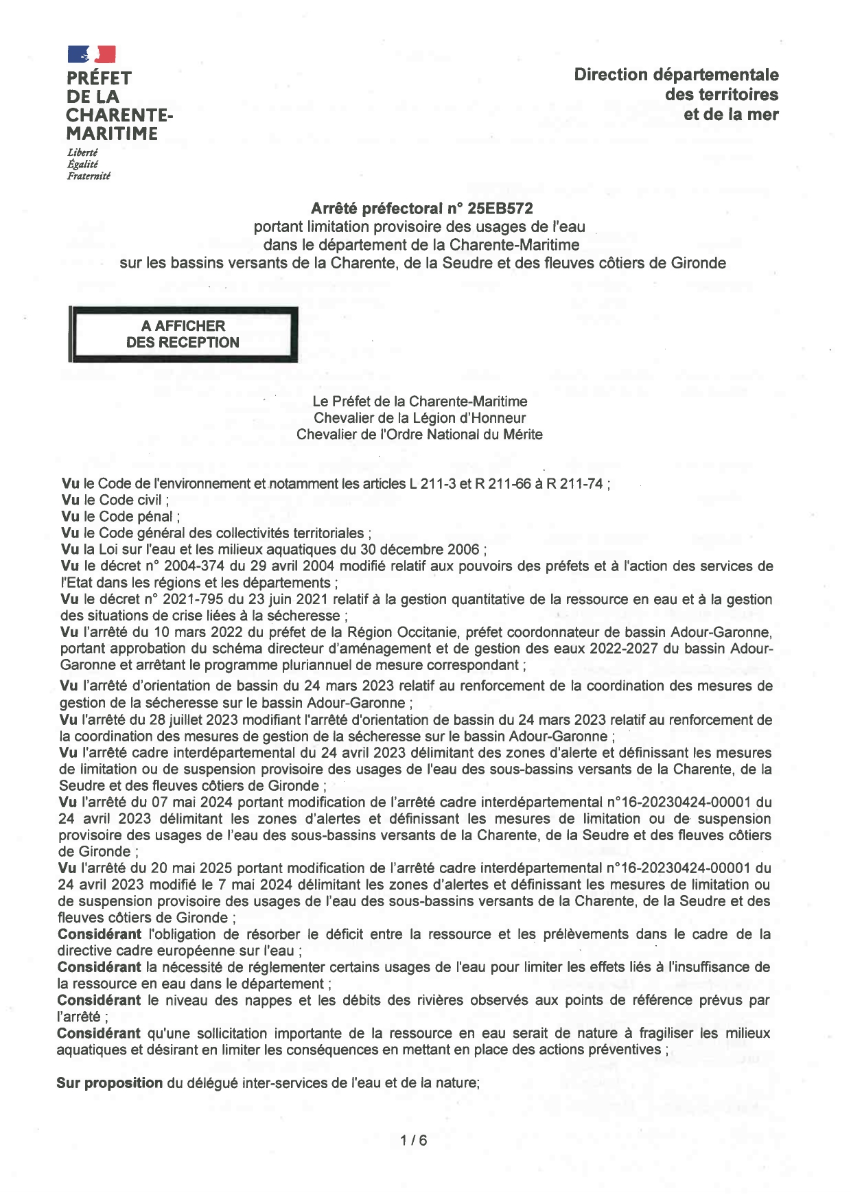 Il est par ailleurs déposé au recueil des actes administratifs de l'Etat en Charente-Maritime et sera consultable demain sur le site VigiEau : https://vigieau.gouv.fr/