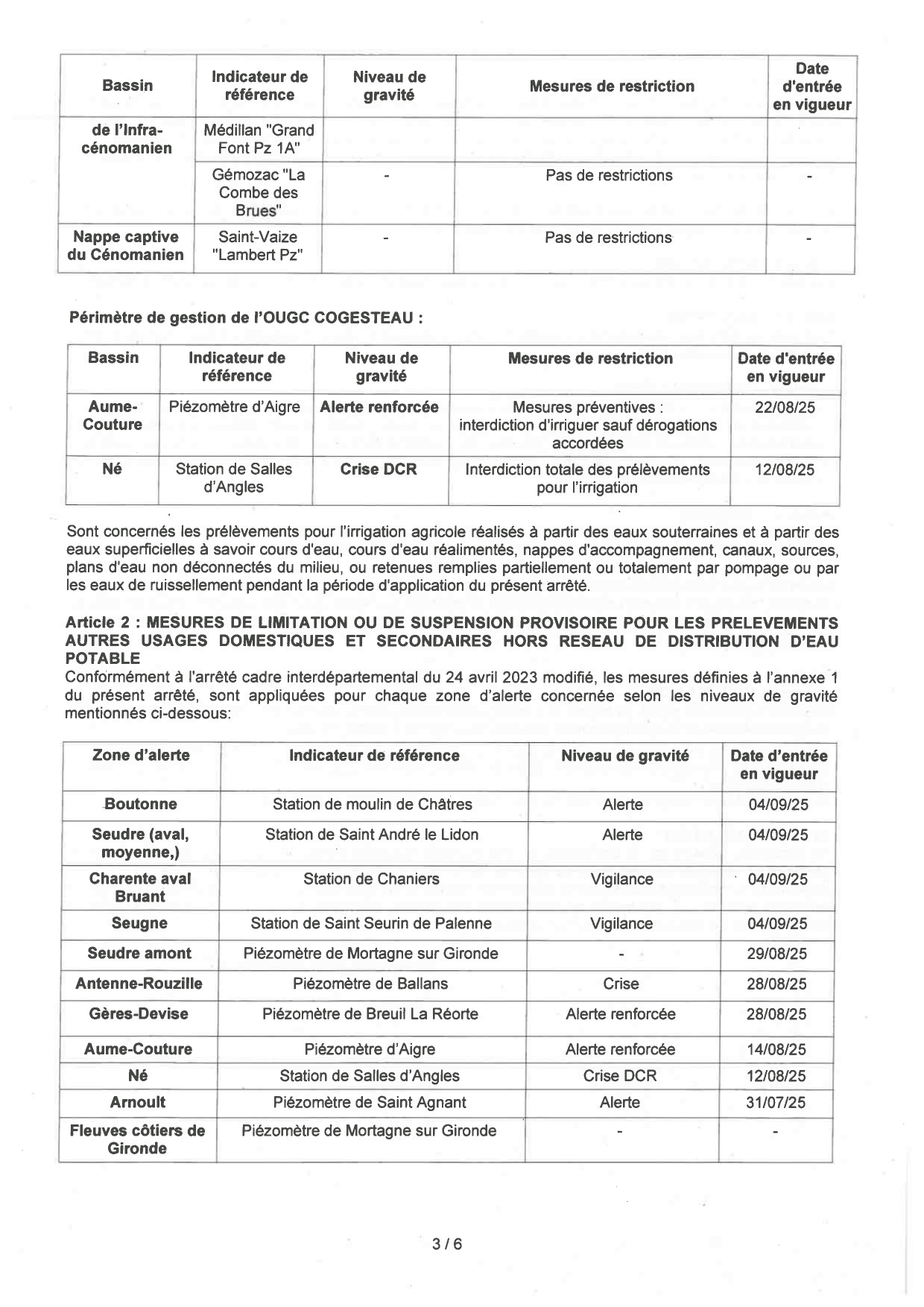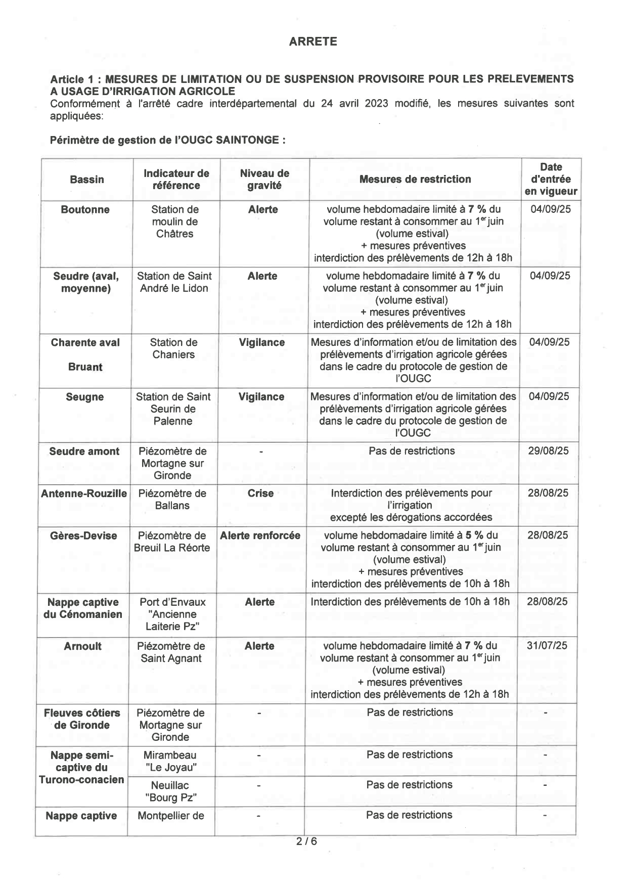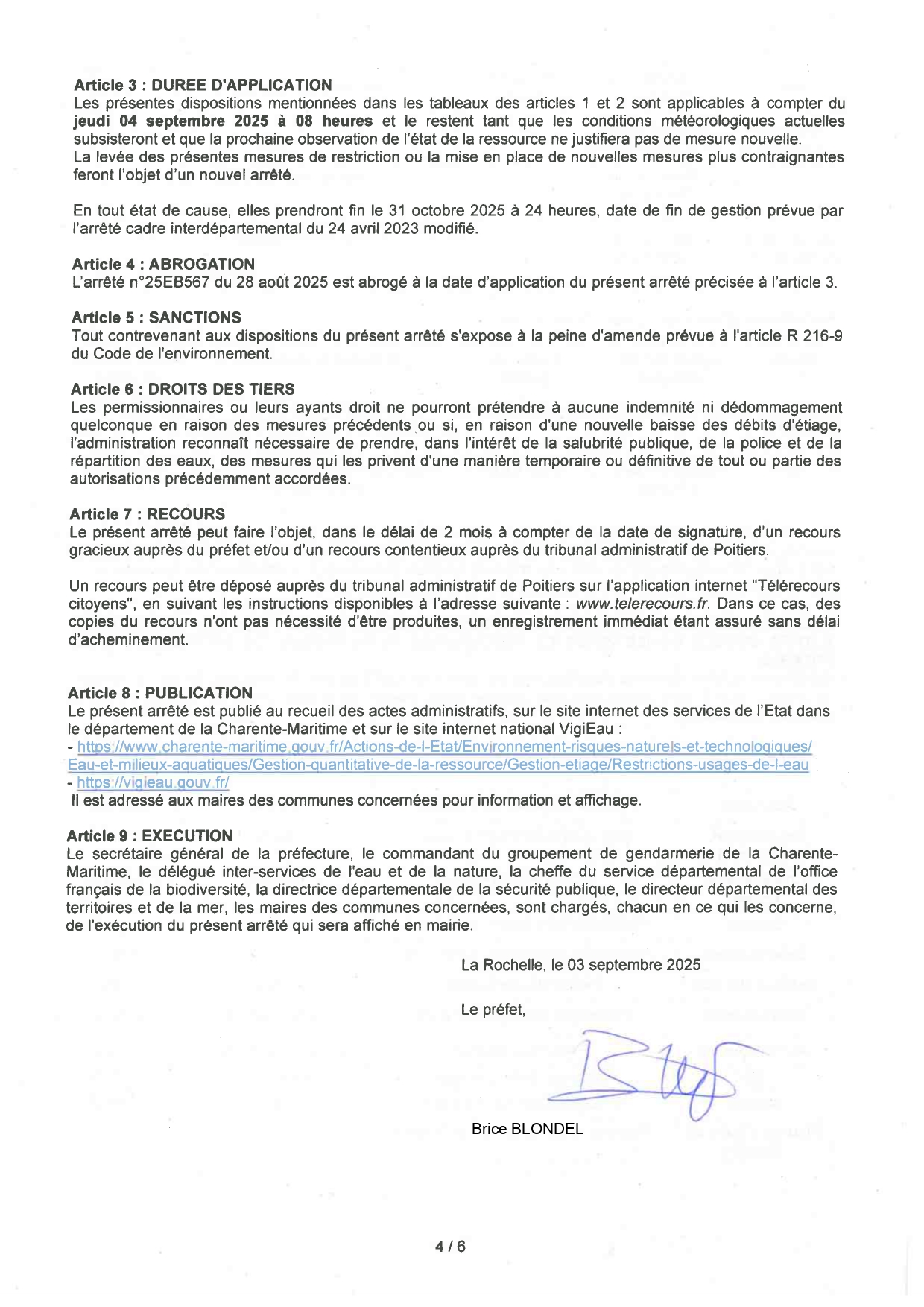 Arrêté 25EB572 du 3 septembre 2025, portant mesures de limitation provisoire des usages de l'eau dans le département de la Charente Maritime sur le périmètre des OUGC Saintonge et Cogest'Eau.