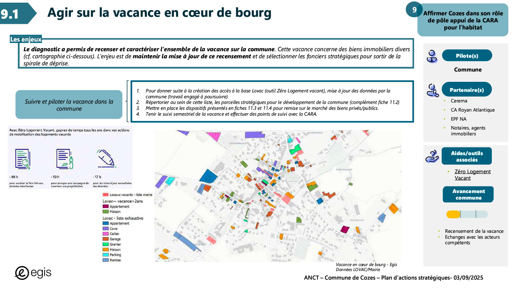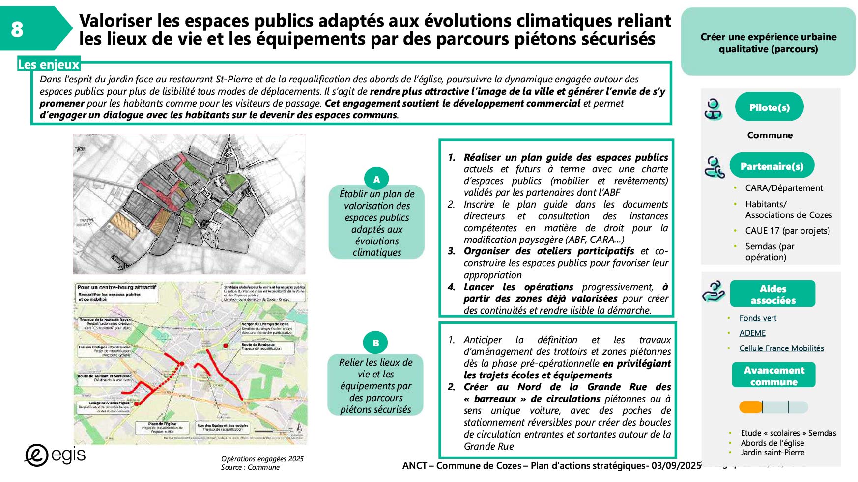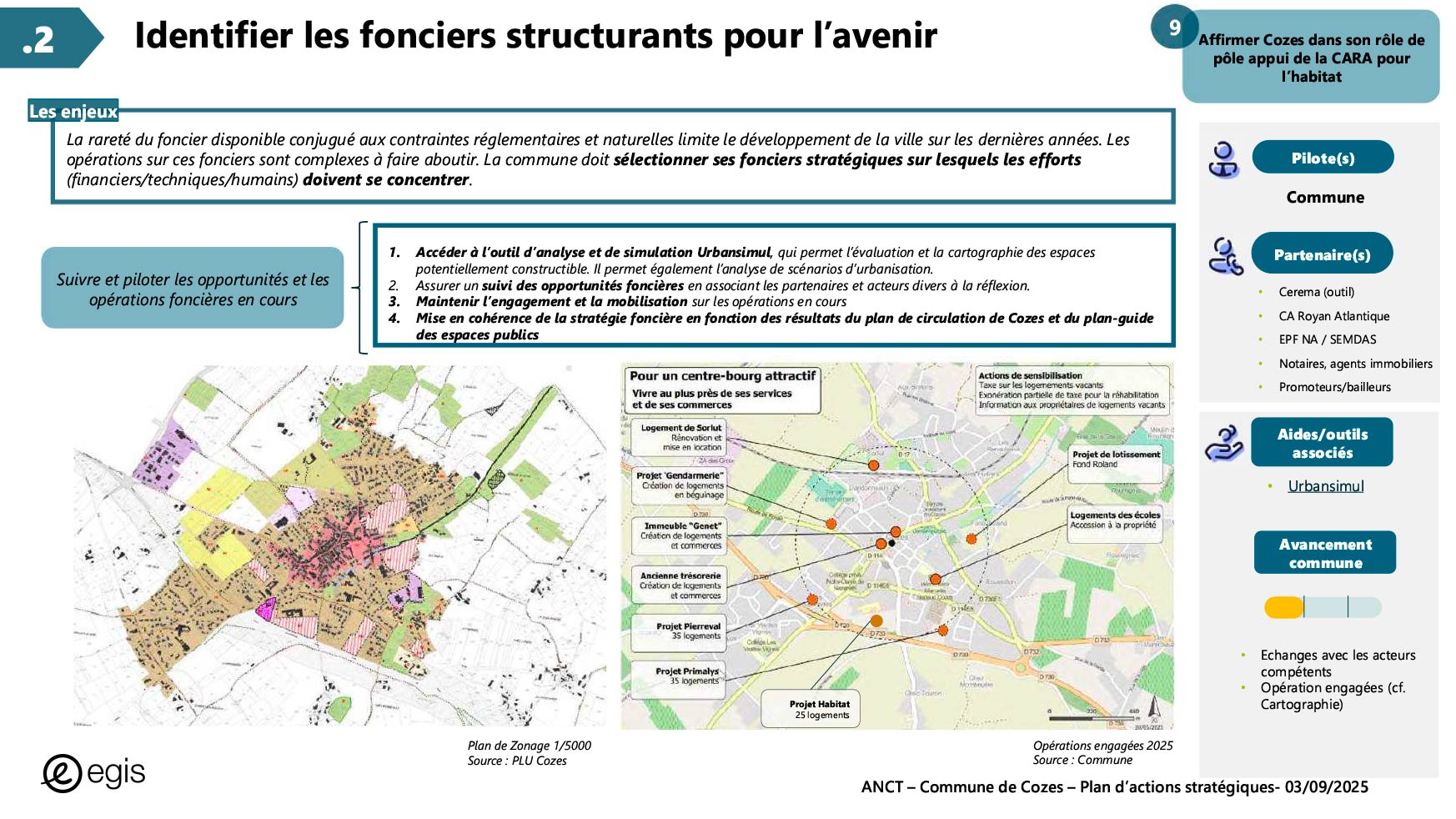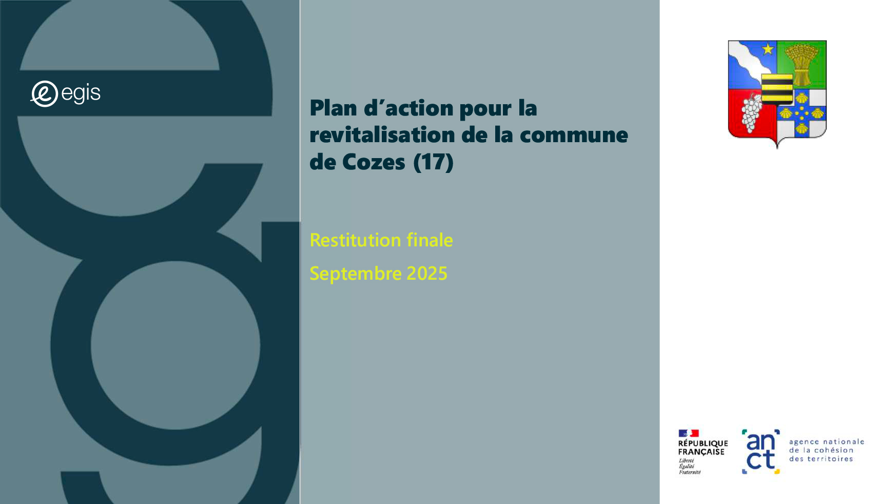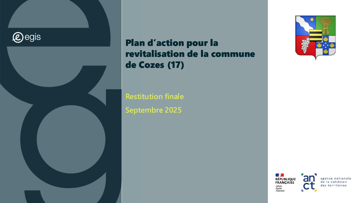 Dans le cadre du programme Villages d'avenir pour lequel la commune de Cozes a été lauréate en 2024, l'Agence Nationale de Cohésion des Territoires (ANCT) a financé une étude réalisée par le Cabinet EGIS ayant pour objet « Plan d'action pour la revitalisation de la commune de Cozes ».