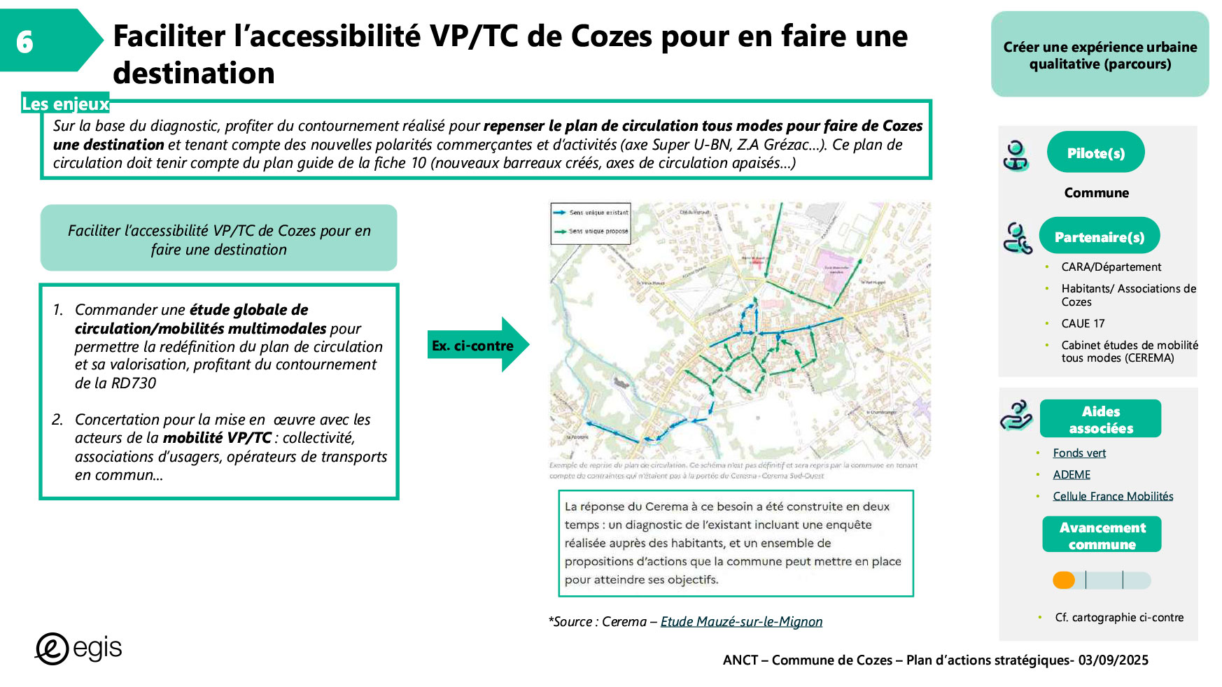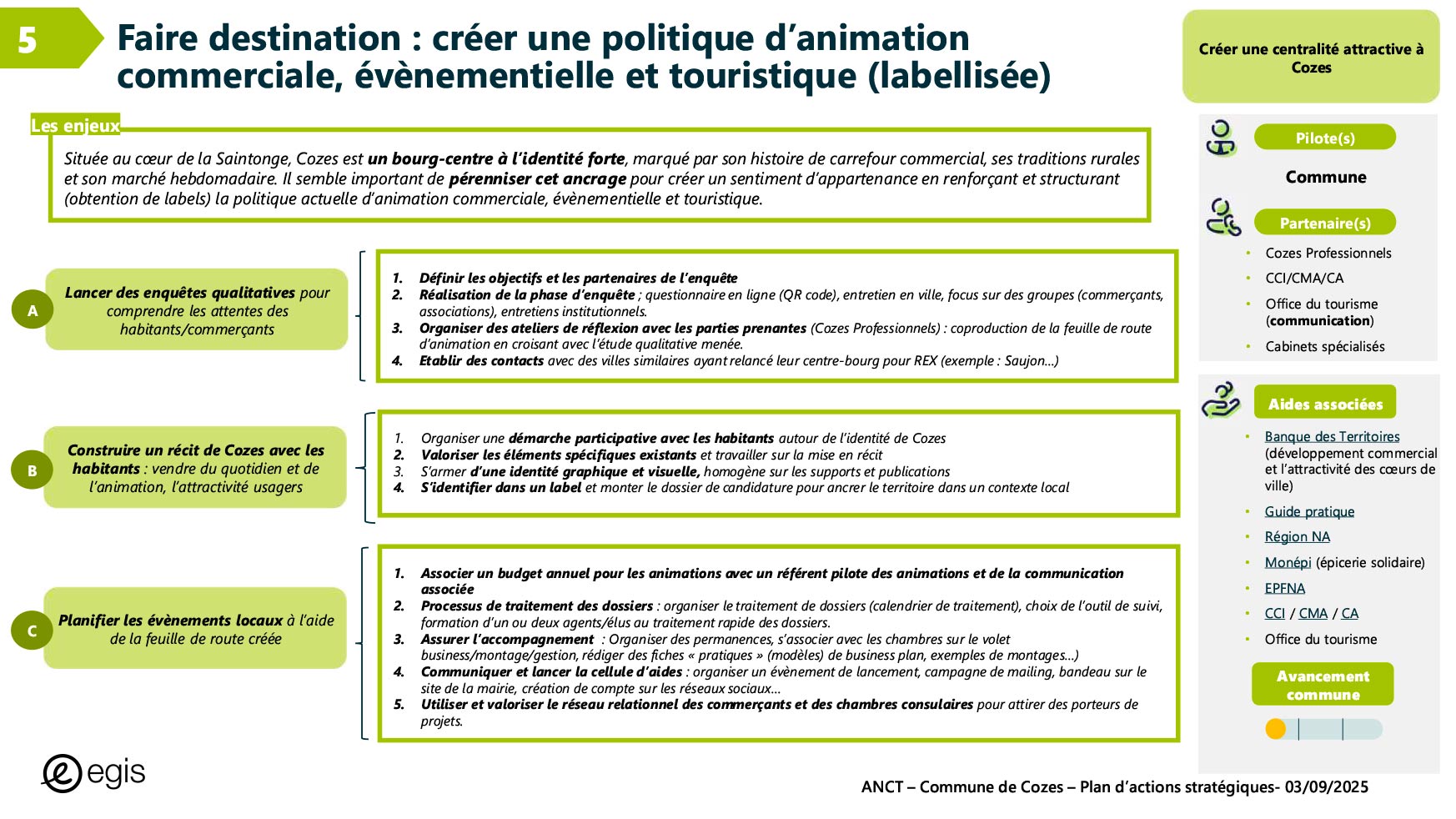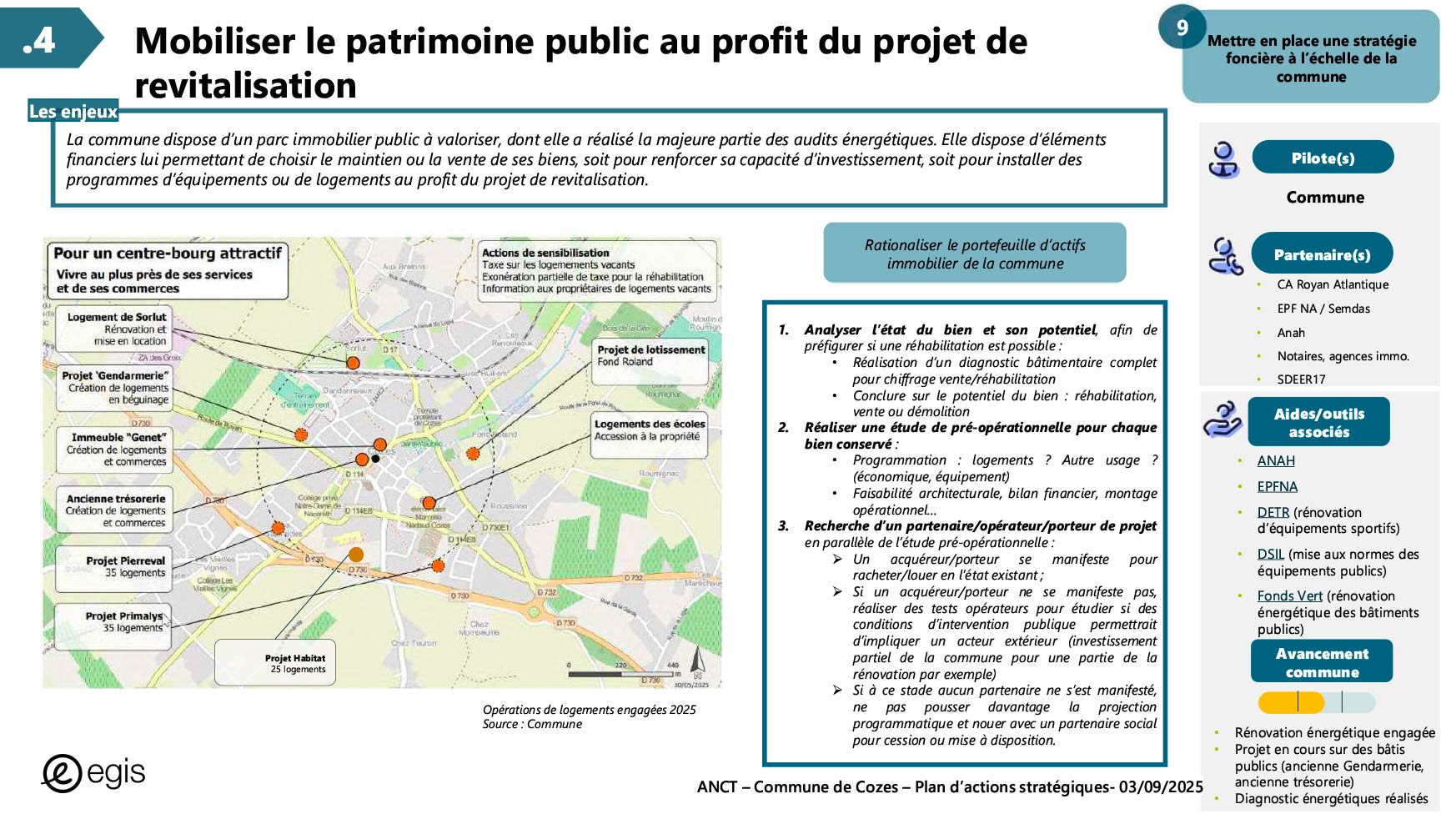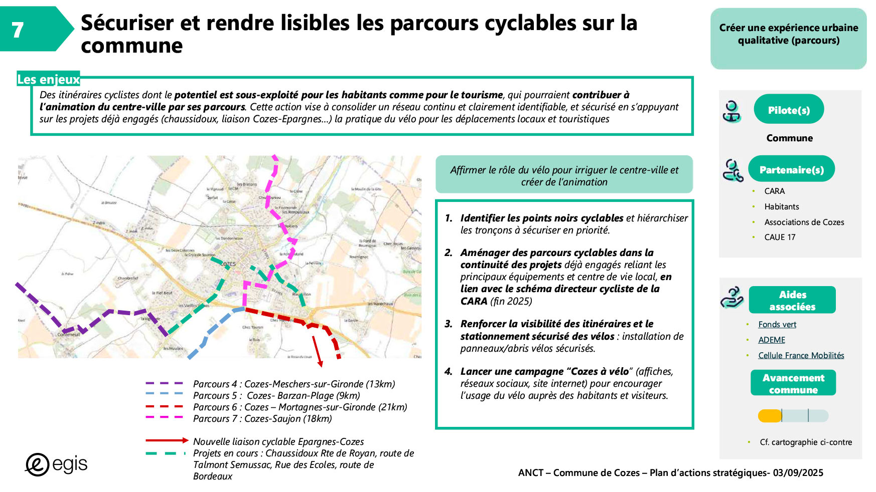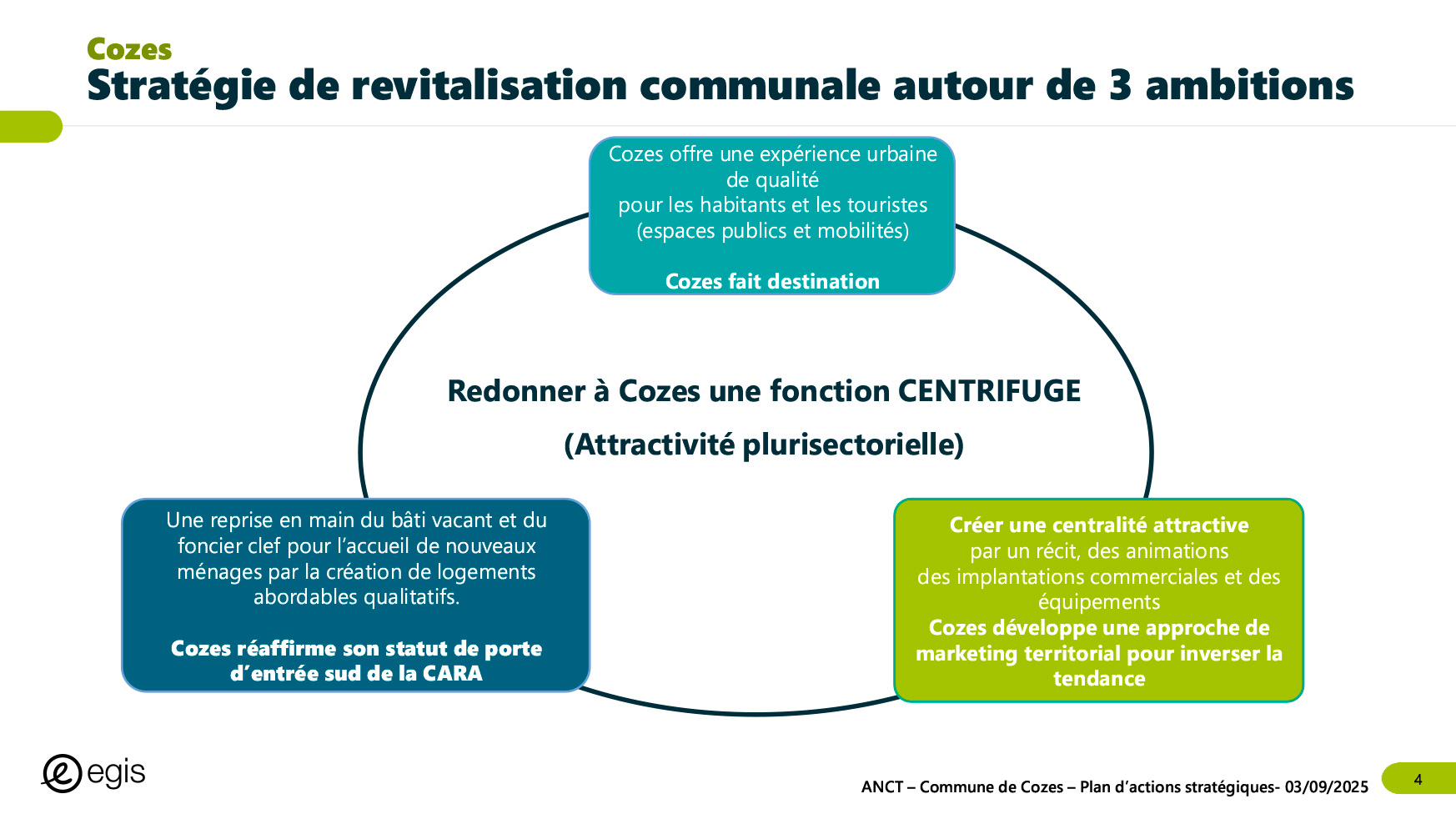 Dans le cadre du programme Villages d'avenir pour lequel la commune de Cozes a été lauréate en 2024, l'Agence Nationale de Cohésion des Territoires (ANCT) a financé une étude réalisée par le Cabinet EGIS ayant pour objet « Plan d'action pour la revitalisation de la commune de Cozes ».