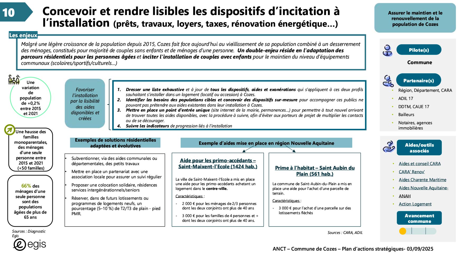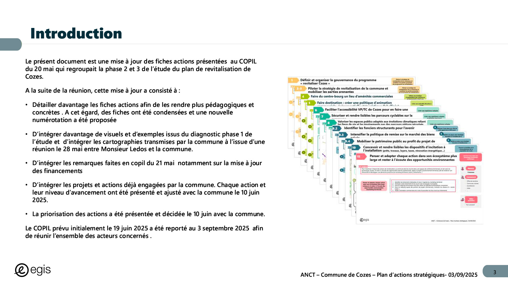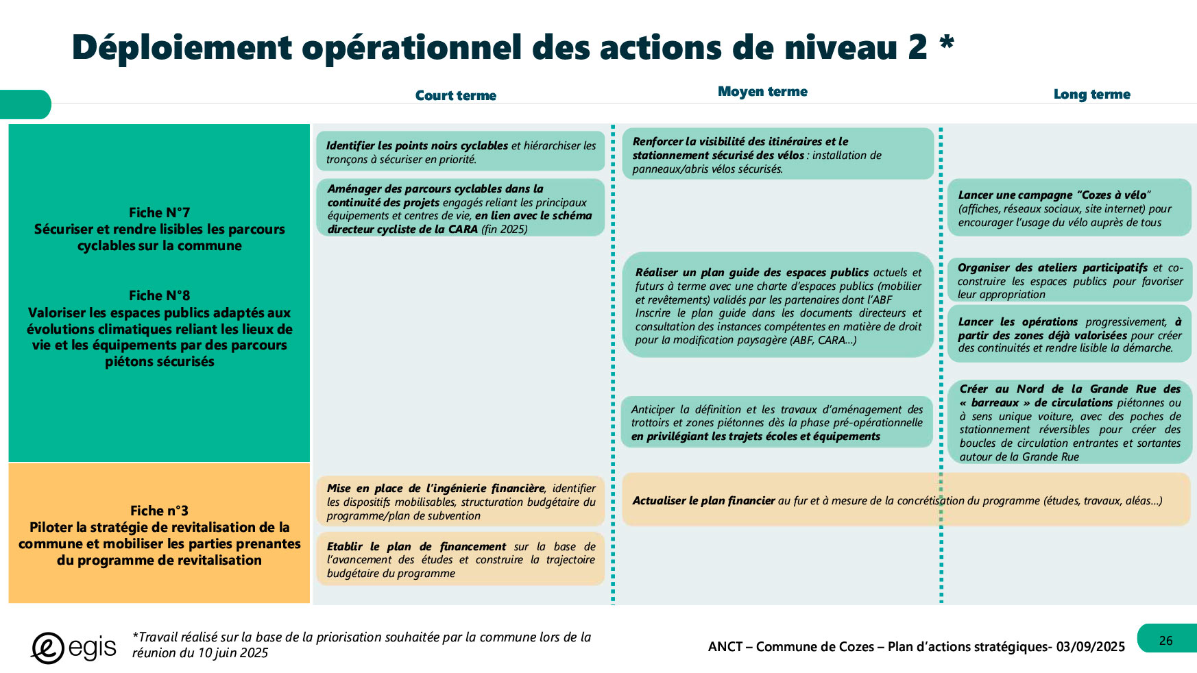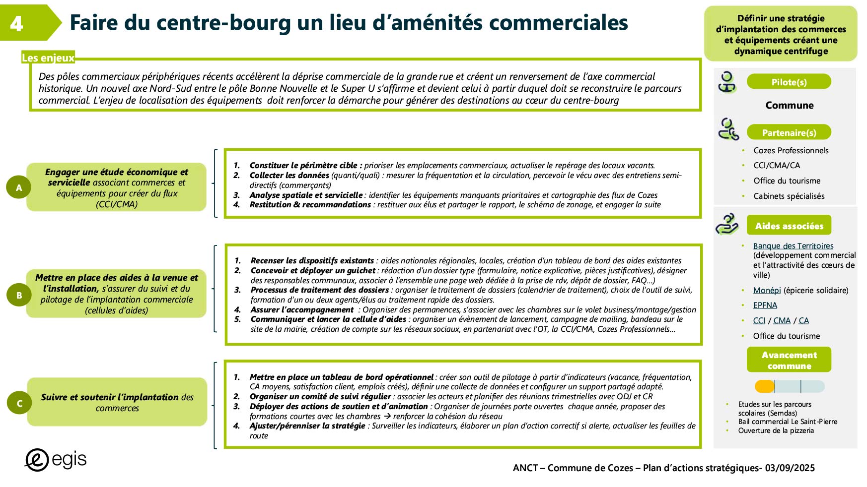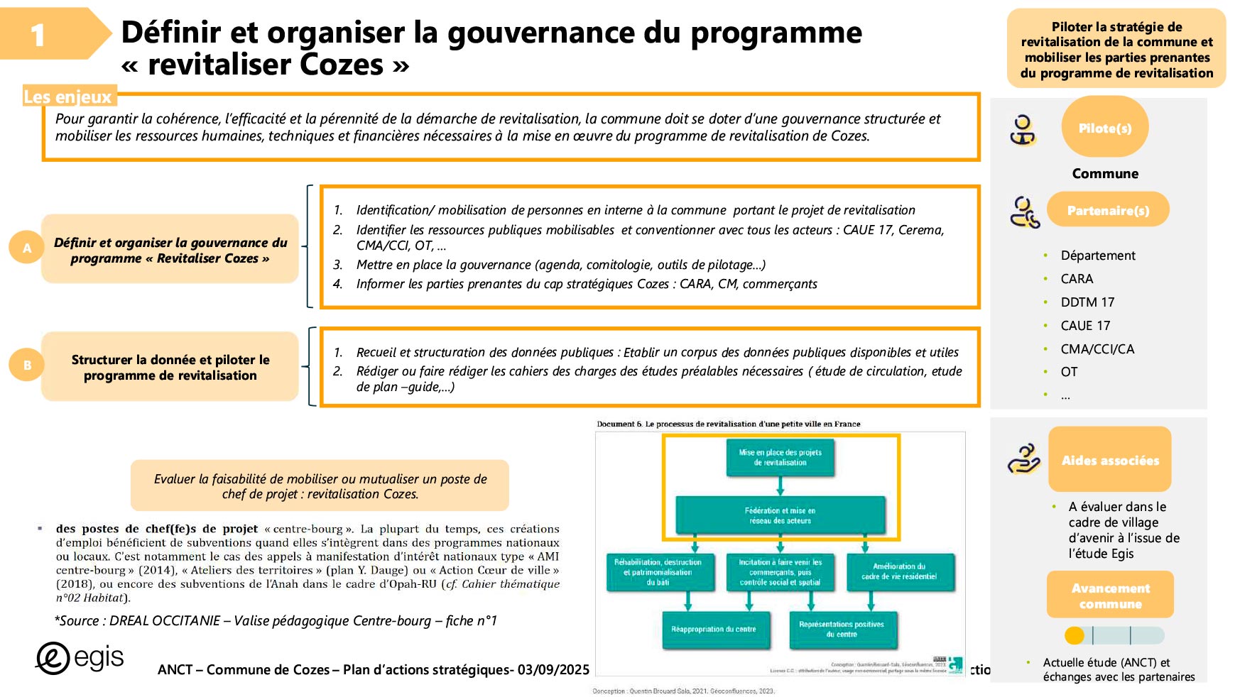 Dans le cadre du programme Villages d'avenir pour lequel la commune de Cozes a été lauréate en 2024, l'Agence Nationale de Cohésion des Territoires (ANCT) a financé une étude réalisée par le Cabinet EGIS ayant pour objet « Plan d'action pour la revitalisation de la commune de Cozes ».