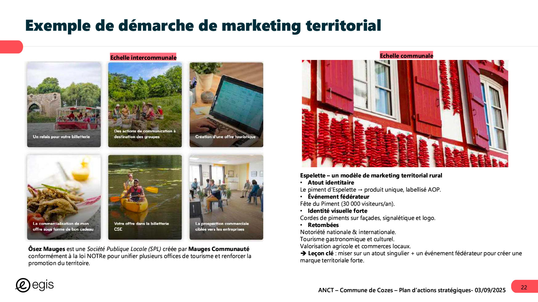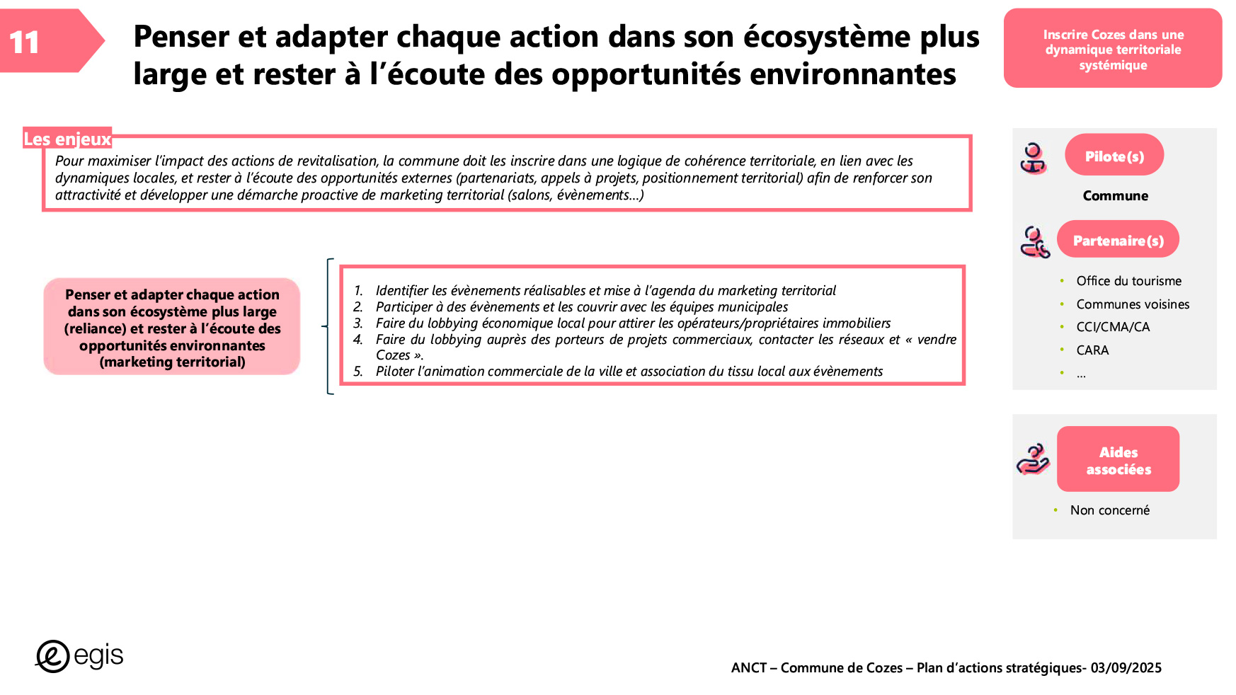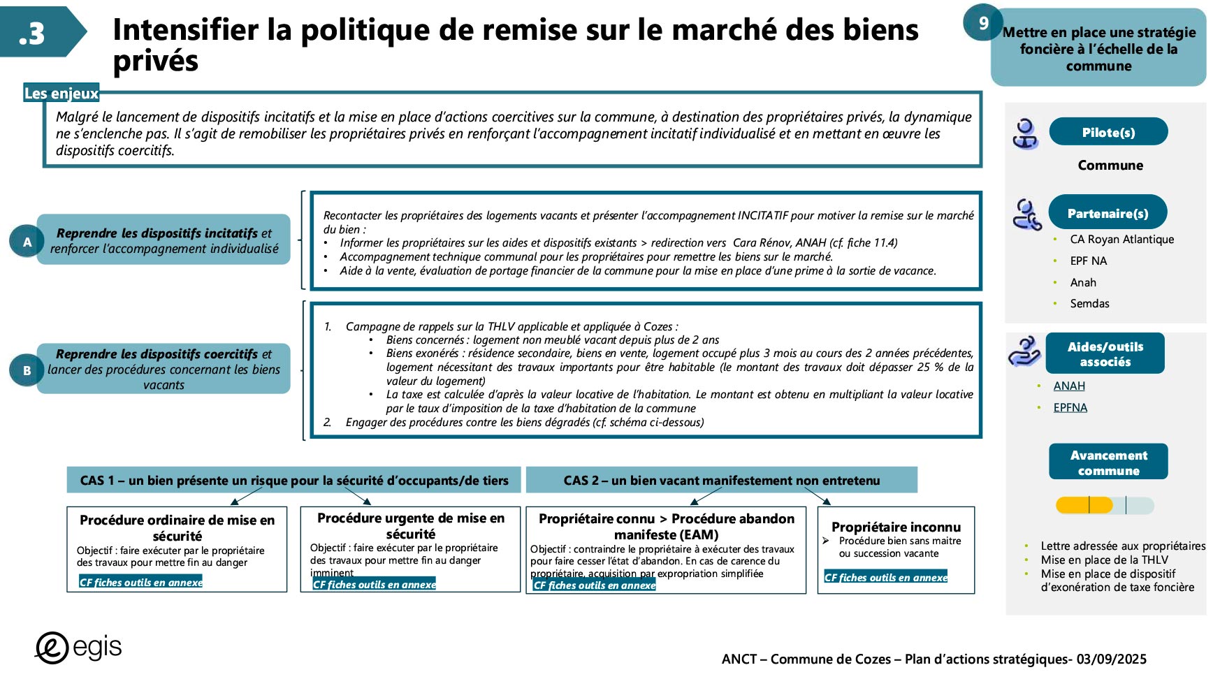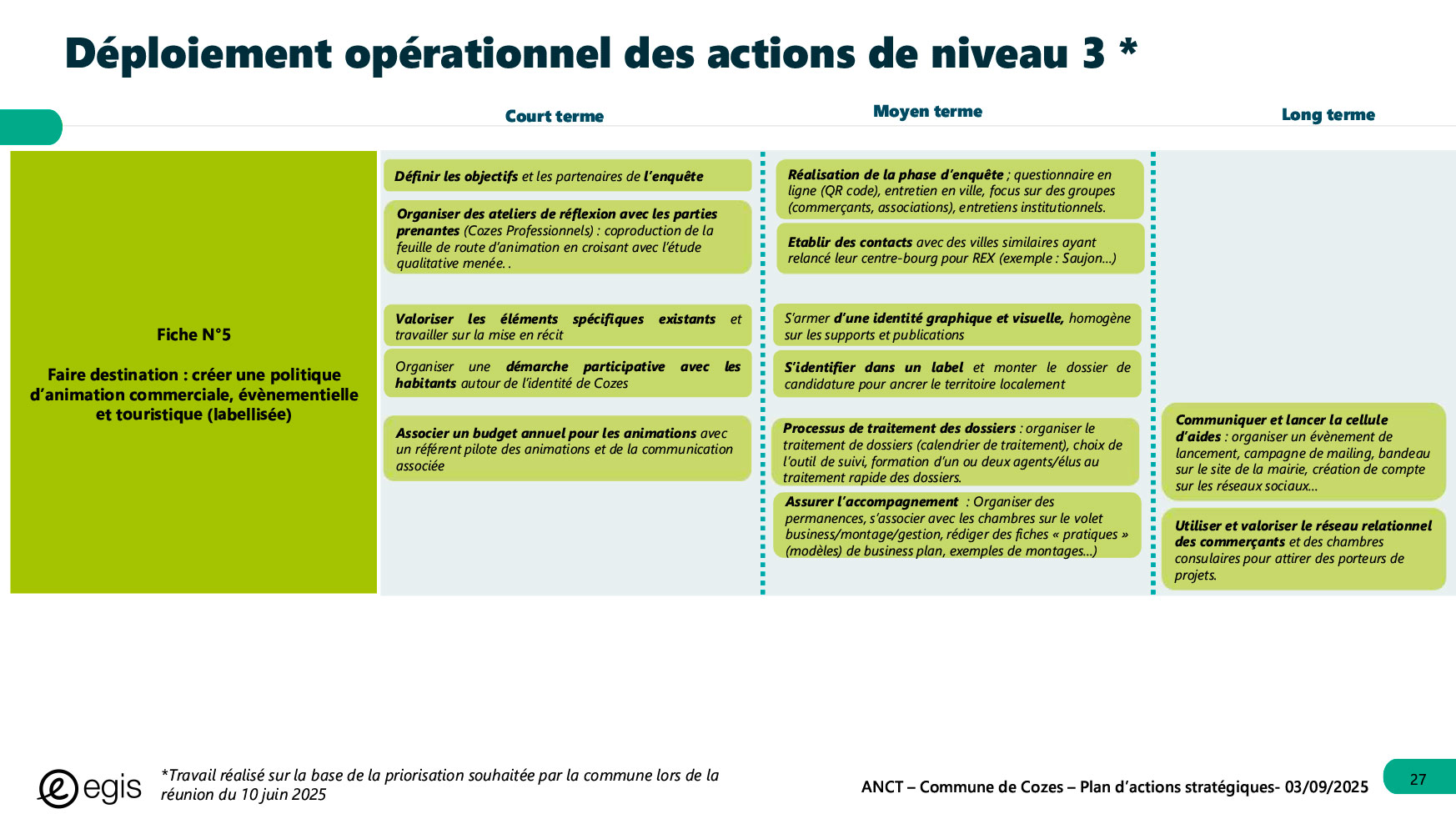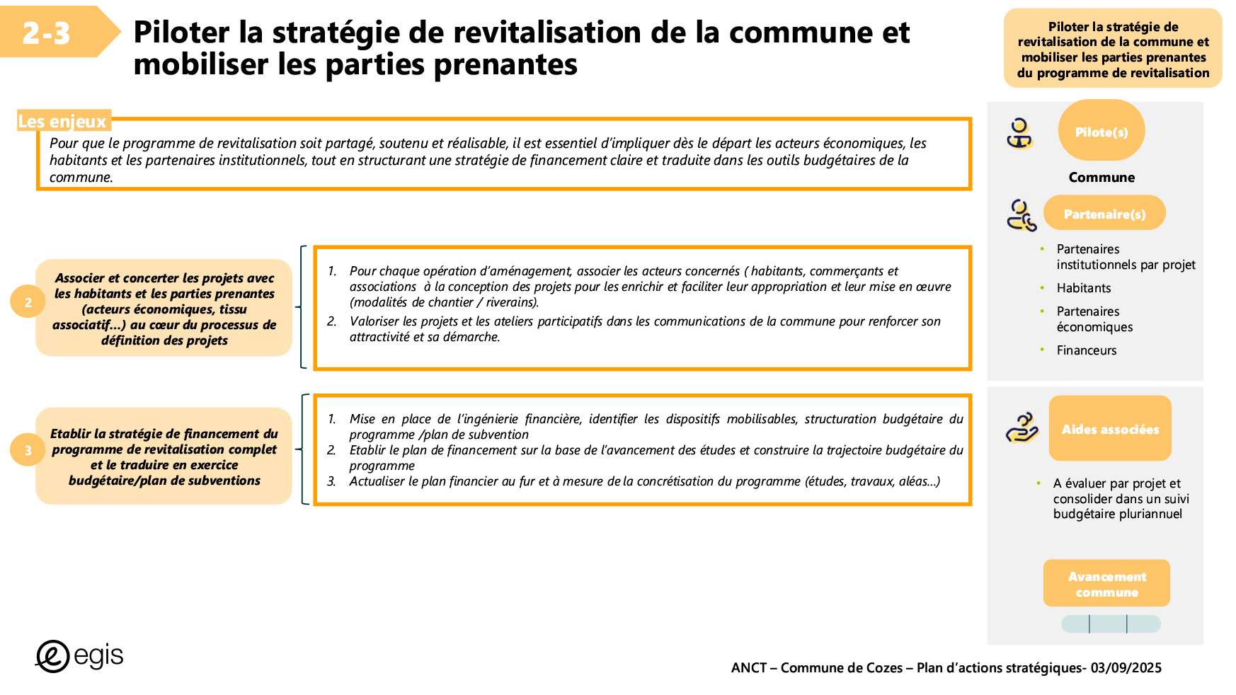Dans le cadre du programme Villages d'avenir pour lequel la commune de Cozes a été lauréate en 2024, l'Agence Nationale de Cohésion des Territoires (ANCT) a financé une étude réalisée par le Cabinet EGIS ayant pour objet « Plan d'action pour la revitalisation de la commune de Cozes ».
