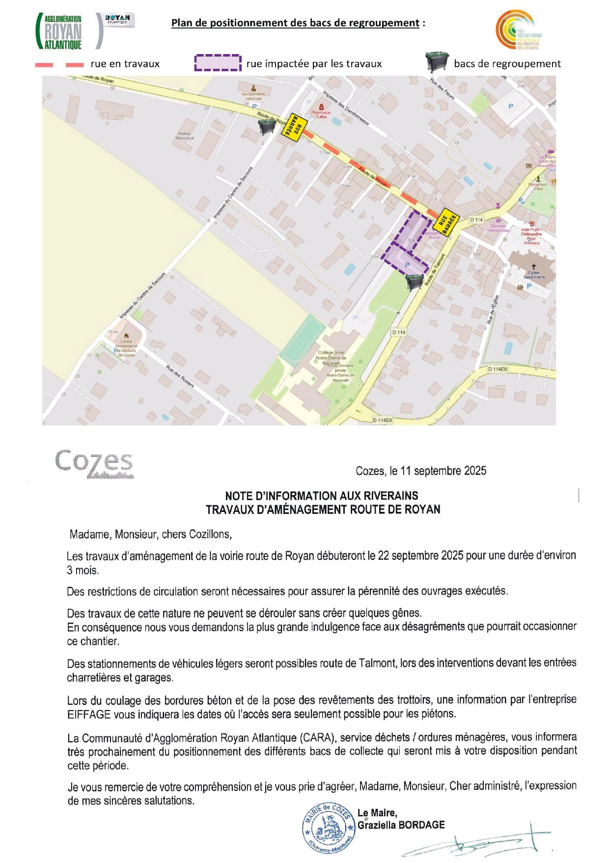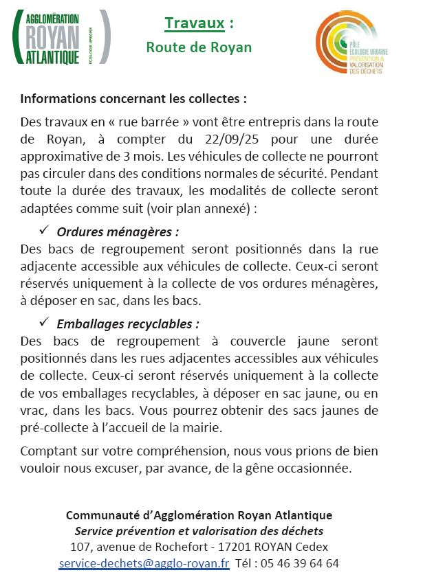 Dans le cadre des travaux d'aménagement Route de Royan, la CARA vous informe des modalités de collecte des bacs de regroupement des ordures ménagères et du tri sélectif.