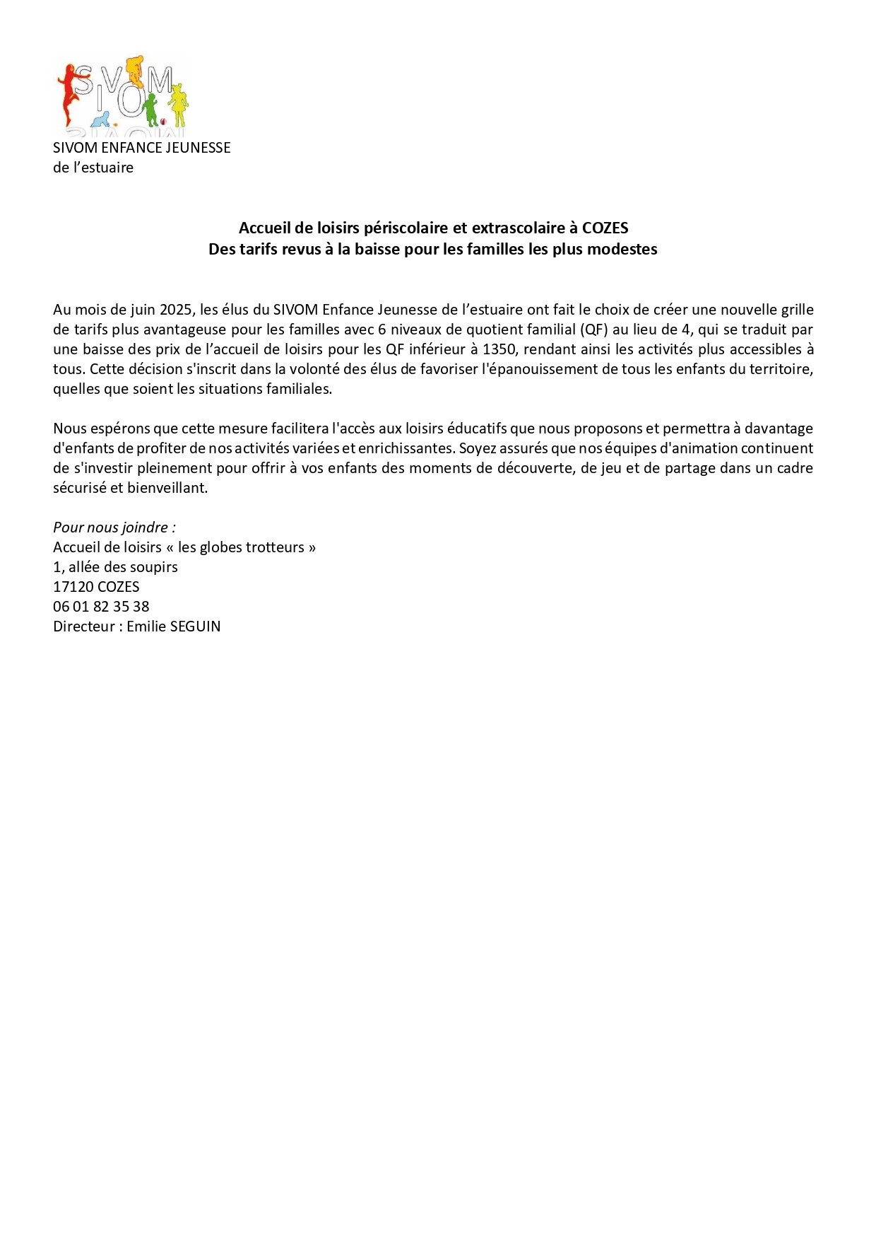 Le SIVOM Enfance Jeunesse de l'Esturaire vous propose une nouvelle grille de tarifs du centre de loisir de Cozes.