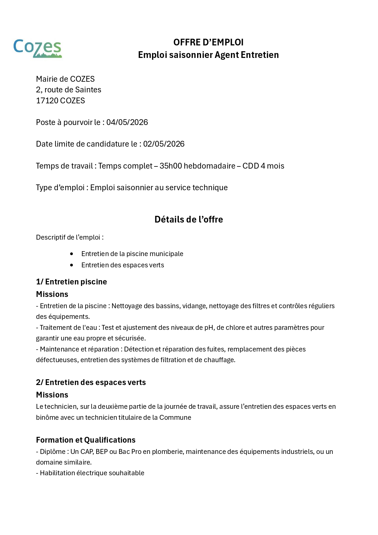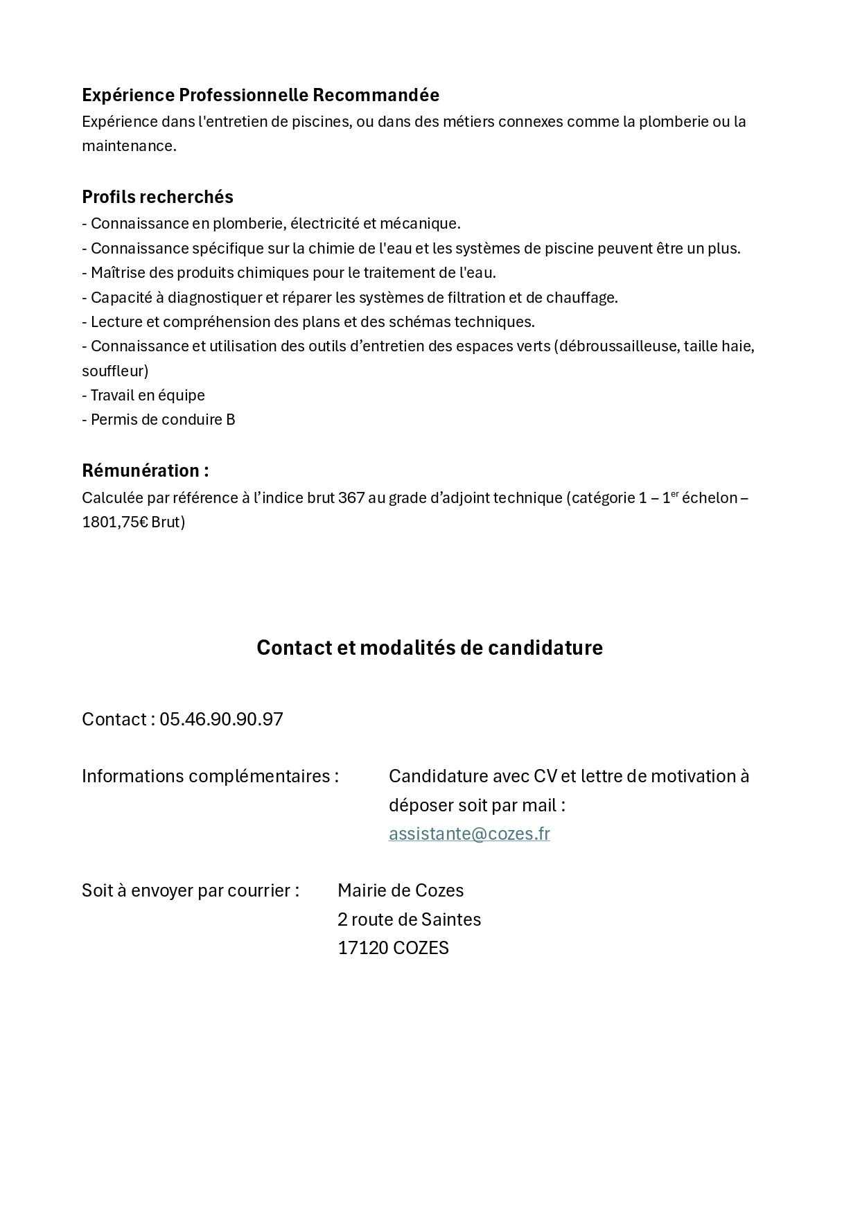 Pour tout renseignements contatcer M. Chauvigné au 06 24 10 69 07