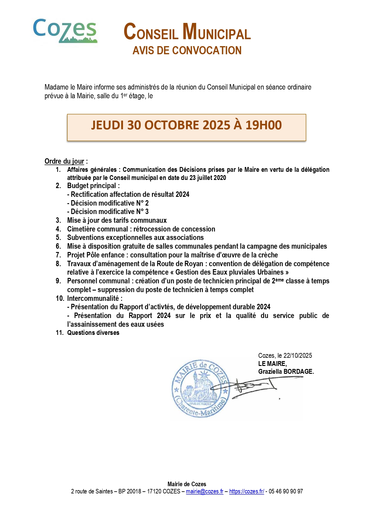 Madame le Maire informe ses administrés de la réunion du Conseil Municipal qui se tiendra en mairie le jeudi 30 octobre 2025 à 19h00.