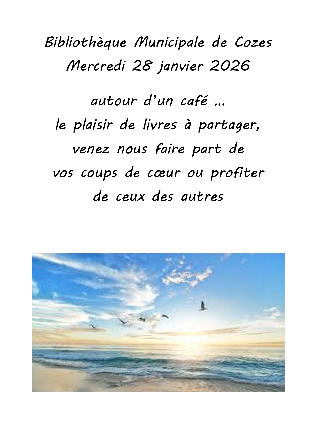 La bibliothèque muncipale de Cozes vous invite à venir partager autour d'un café vos coups de coeur littéraires ou ceux des autres.